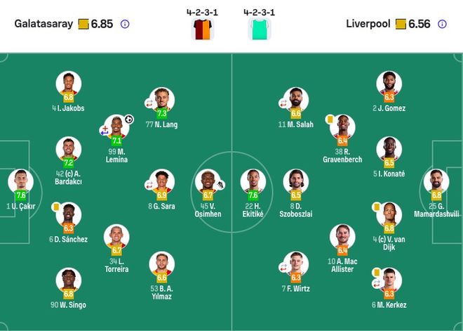 加拉塔薩雷首發(fā):1-恰基爾、4-伊斯梅爾·雅各布斯、42-巴爾達(dá)克徹、6-達(dá)文森·桑切斯、90-辛格、99-勒米納(77'11-阿克金)、34-托雷拉(93'17-埃爾馬利)、77-諾阿·朗(77'7-紹洛伊)、8-薩拉(87'93-博伊)、53-伊爾馬茲(93'20-京多安)、45-奧斯梅恩